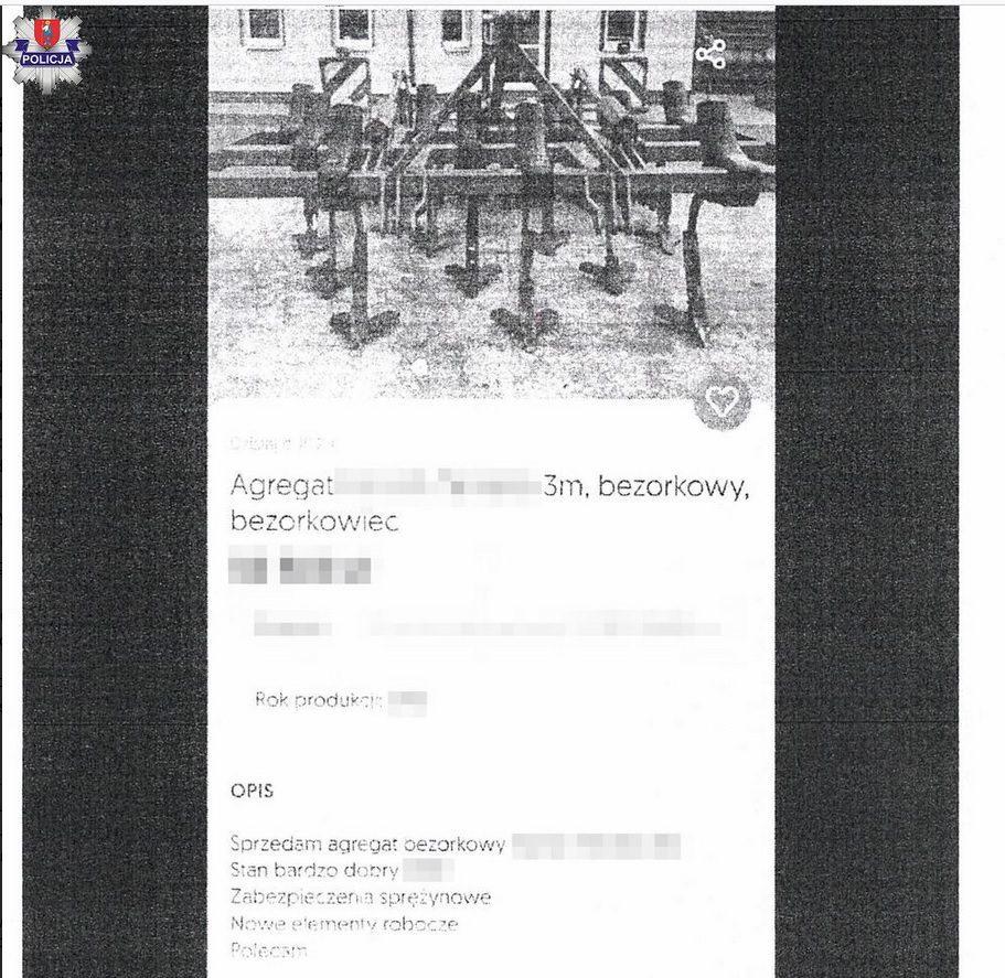 W miniony weekend do komendy przyszedł 24-letni mieszkaniec Zamościa mówiąc, że został oszukany. Zamojskim policjantom wyjaśnił, że na portalu ogłoszeniowym odnalazł ofertę sprzedaży maszyny rolniczej – agregatu bezorkowego. Wykonał telefon na numer wskazany w ogłoszeniu. Rozmówca potwierdził ofertę, powiedział, że maszyna będzie sprowadzona z Niemiec jest kompletna i bez uszkodzeń. Wspólnie ustalili cenę na kwotę 31 tysięcy złotych. Od sprzedającego 24-latek otrzymał numer rachunku, na początku wpłacił zaliczkę w wysokości blisko 10 tysięcy złotych. Resztę miał dopłacić w czasie odbioru maszyny. Następnego dnia 24-latek dowiedział się, że urządzenie jest już w Polsce, umówili więc datę odbioru towaru. Z uwagi na to, że sprzedający powiedział, że wyda maszynę, jeśli pieniądze będą zaksięgowane na jego koncie, kupujący zdecydował się przelać resztę pieniędzy. Po tej drugiej wpłacie sprzedający przestał odbierać telefony od 24-latka, później numer stał się nieaktywny. W Internecie na innej stronie zauważył ofertę sprzedaży maszyny, którą zakupił. Zrozumiał, że został oszukany. Na nieuczciwej transakcji stracił 31 tysięcy złotych.