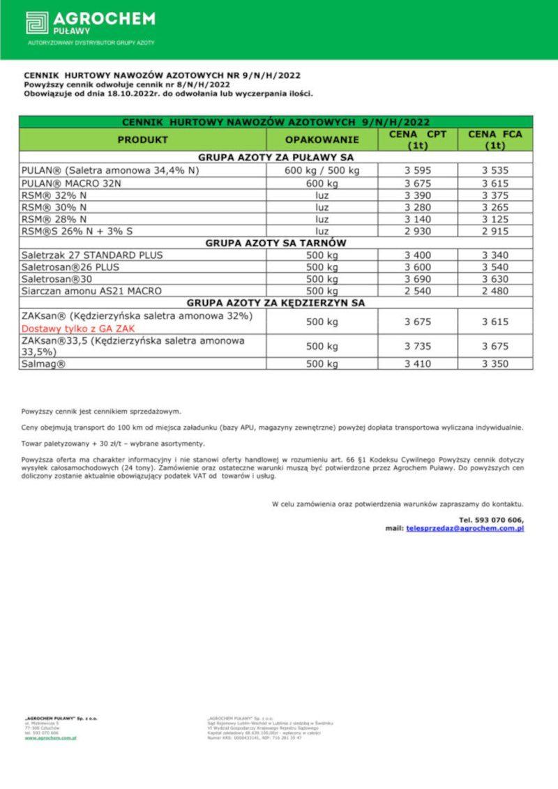 Wraz ze wstrzymaniem produkcji nawozów przez Agrochem Puławy, co miało miejsce w sierpniu, publikacja cennika została wstrzymana. W ostatnim czasie zakłady wznowiły jednak działalność, a kilka dni po tym pojawiła się broszura informująca o aktualnych cenach surowca.