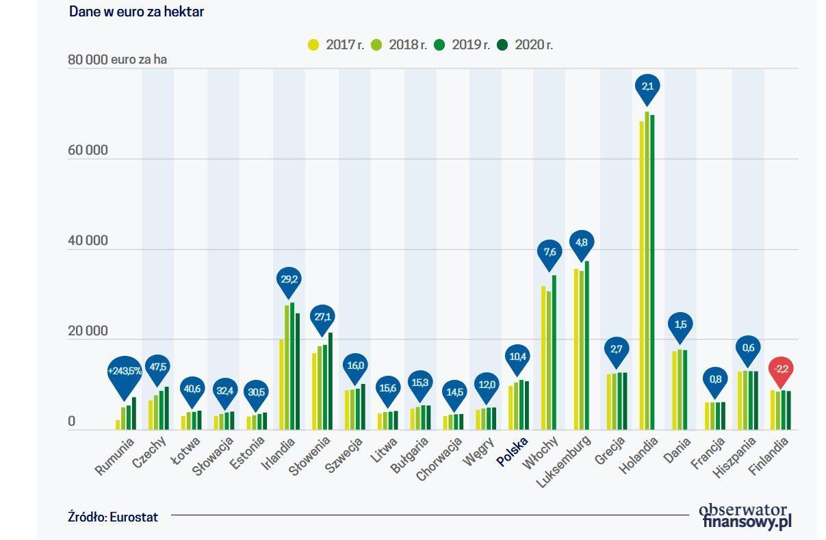 W Polsce – jak wynika z danych Eurostatu – cena ziemi rolnej wynosiła w 2020 r. przeciętnie blisko 47,6 tys. złotych za hektar, a licząc we wspólnej walucie, co umożliwia porównania z innymi krajami unijnymi, 10 711 euro. To wyższa cena niż np. w Szwecji, Czechach, Finlandii a nawet we Francji. Według danych Eurostatu zróżnicowanie cen hektara ziemi kształtowała się u nas w 2020 r. w relacji mniejszej niż 1 do 3, od 6503 euro w województwie zachodniopomorskim po 14 271 euro za ha w sąsiadującym z nim województwie wielkopolskim. Porównując z innymi regionami europejskimi, cena ziemi rolnej w Wielkopolsce jest jedynie nieznacznie niższa niż w Katalonii (14 827 euro w 2020 r.).
