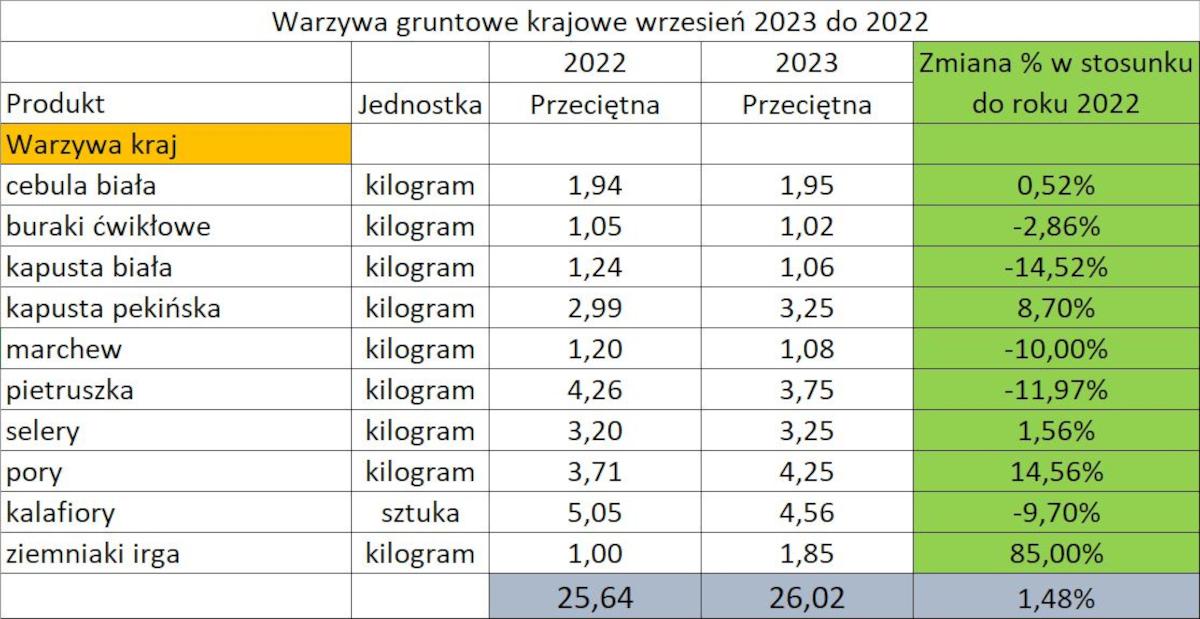 Warto przy tym zaznaczyć, że są to średnie ceny z września. Obecnie, czyli na początku października, obserwujemy wzrost podaży niektórych warzyw i zarazem spadek ich cen. Tyczy się to chociażby kapusty pekińskiej, cebuli czy selerów. Co ważne, pomijając ziemniaki w zestawieniu z września, 2023 rok wypadałyby znacznie gorzej.