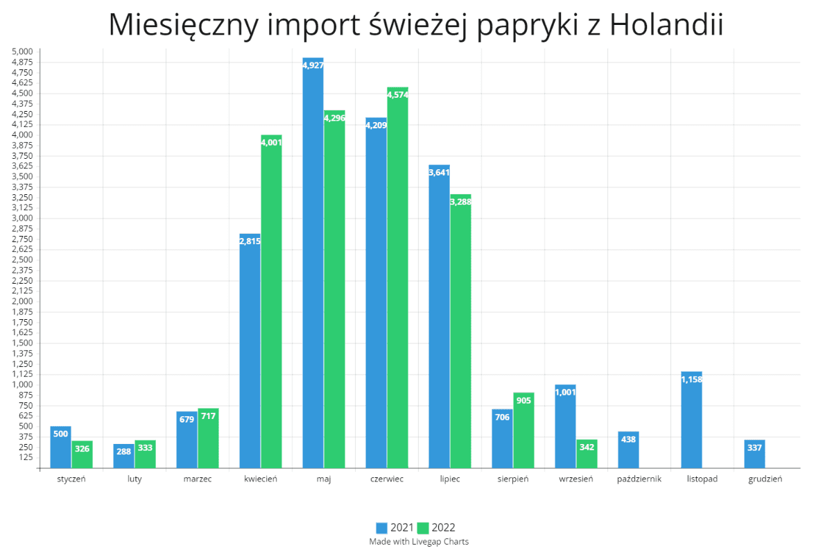 Finalnie okazuje się, że papryka z zagranicy nie zniknęła z rynku tak szybko, co potwierdzają dane przedstawione przez Eurostat. Na poniższym wykresie wyraźnie widać, że jeszcze w sierpniu zrealizowano dostawy 905 ton warzywa, co jest wynikiem wyższym aniżeli w ubiegłym sezonie. Mowa o papryce pochodzącej z Holandii, gdyż to właśnie tamtejszy produkt zalewał nasz rynek w największym stopniu. Sytuacja mogłaby wyglądać znacznie gorzej, jeśli producenci zaakceptowaliby to, co działo się na krajowym rynku... Co prawda brakuje danych tyczących się ostatnich trzech miesięcy, jednak możemy zauważyć jak sprawy miały się w szczycie sezonu. Liczby przedstawione są w tonach.