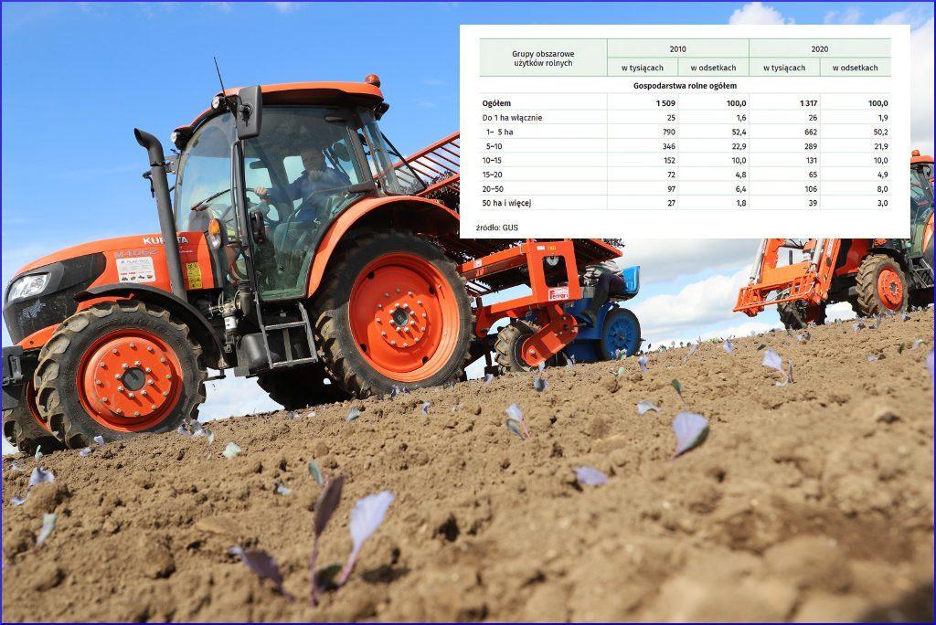 Z danych ostatniego spisu rolnego wynika, że w Polsce w 2020 r. było 1 mln 317 tys. gospodarstw rolnych (w tym 1 mln 310 tys. indywidualnych) - o 192 tys. mniej (12,7 proc.). W porównaniu z wynikami spisu sprzed dekady widać ogromny wzrost w zakresie powyżej 50 hektarów (+45%) i niewielki 20-50 hektarów (+9%).