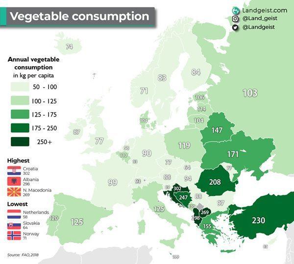 Co ciekawe, spożycie warzyw jest wielokrotnie wyższe w południowo-wschodniej Europie. Albania, Bośnia, Chorwacja, Macedonia Północna i Turcja spożywają rocznie ponad 200 kg warzyw. Chociaż wydaje się, że nie ma korelacji między spożyciem warzyw a spożyciem mięsa, widzimy, że niektóre kraje europejskie, które mają niskie spożycie mięsa, nadrabiają to, spożywając znacznie więcej warzyw.