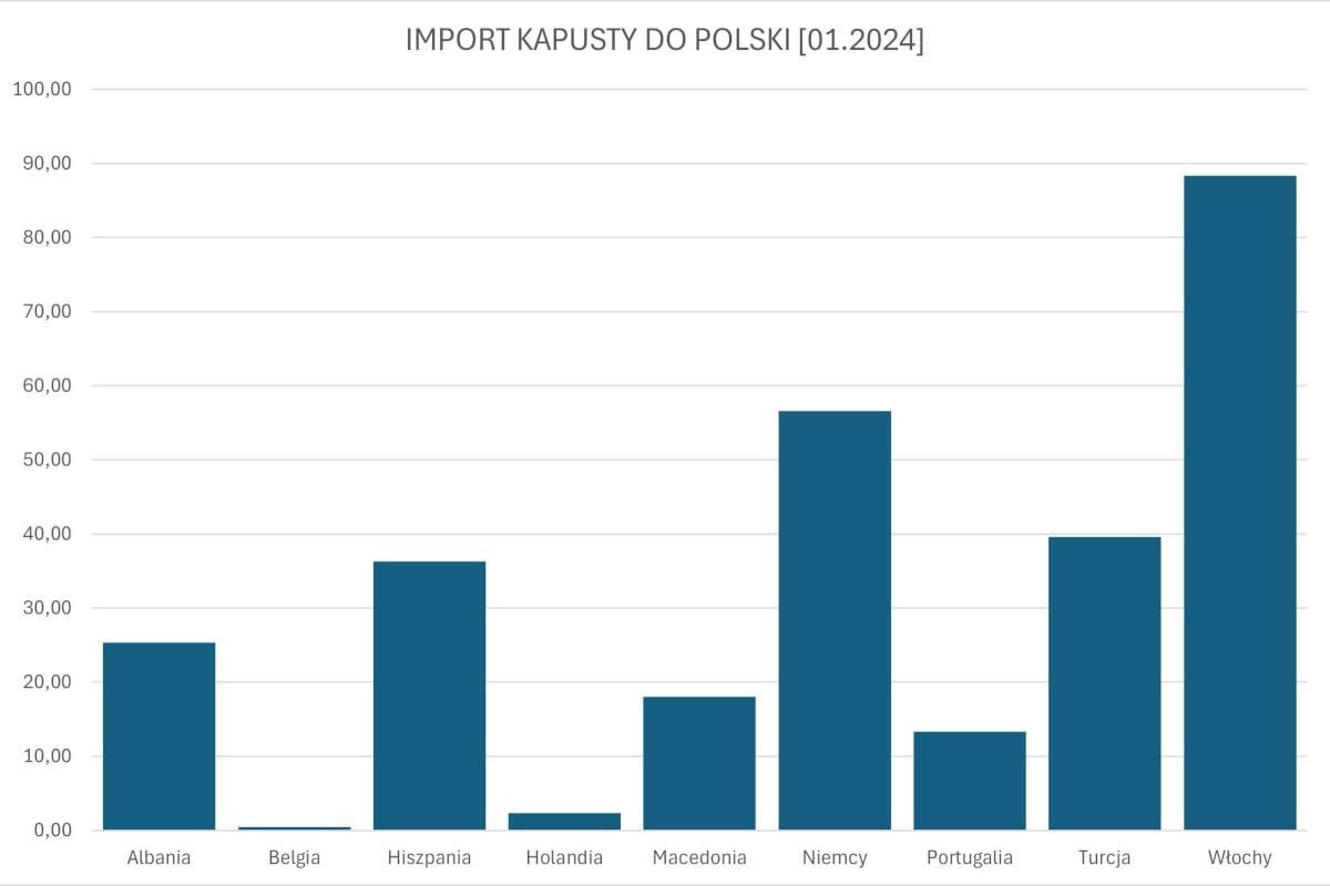 W pierwszym miesiącu 2024 roku importowana kapusta okazała się dość zauważalna na krajowym rynku. Według oficjalnych danych sprowadzono wówczas 280,30 ton towaru. Wartość sprowadzonej kapusty przedstawia się na poziomie 1,14 mln złotych. Najwięcej importerzy sprowadzili z Włoch, Niemiec i Turcji. Niemniej, lista jest znacznie dłuższa.