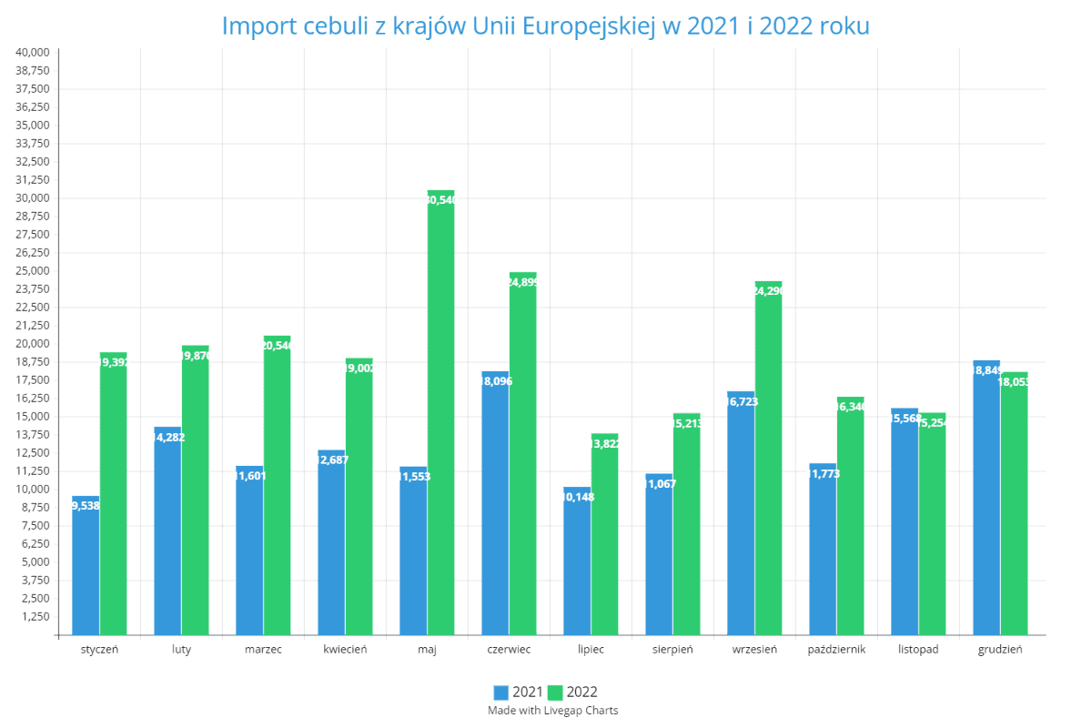 W 2022 roku niemal w każdym miesiącu odnotowano wzrost importu cebuli. Wyjątkiem są listopad oraz grudzień. W owym okresie zapotrzebowanie na produkt było jednak bardzo wysokie w wielu krajach. Z tego względu importerzy mogli nie mieć możliwości sprowadzenia większych partii na polski rynek. Są to oczywiście tylko domysły. Popyt w wymienionych miesiącach mógł być bowiem niewystarczający i równie dobrze to mogło być powodem utrzymania importu na stosunkowo zbliżonym poziomie względem 2021 roku.