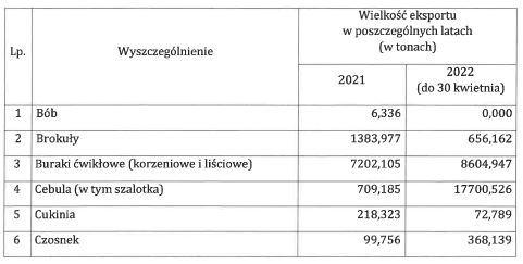 Wolumen eksportu znacznie wzrósł w bieżącym roku, tylko w okresie styczeń-kwiecień 2022 r. wyeksportowano o ponad 17% więcej warzyw niż w całym 2021 r. W analizowanym okresie świeże warzywa eksportowane były do 16 państw: Białoruś, Czarnogóra, Jordania, Kazachstan, Korea Południowa, Kosowa, Królestwo Arabii Saudyjskiej, Mongolia, Mołdawia, Norwegia, republika Macedonii Północnej, Serbia, Stany Zjednoczone, Ukraina, Zjednoczone, Emiraty Arabskie. Największą ilość tego asortymentu wyeksportowano do Białorusi i Ukrainy, udział eksportu do tych państw wyniósł łącznie w 2021 r – 93%, a w okresie styczeń kwiecień br. -91%.