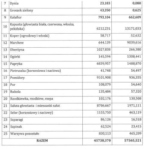 Jak podaje PIORiN wolumen eksportu znacznie wzrósł w bieżącym roku, tylko w okresie styczeń-kwiecień 2022 r. wyeksportowano o ponad 17% więcej warzyw niż w całym 2021 r. Z kolei import warzyw z krajów z przeznaczeniem do Polski w latach 2020-2021 wyniósł ponad 106 tys. ton, a w 2022 (do 30 kwietnia) - ok. 38 tys. ton warzyw.