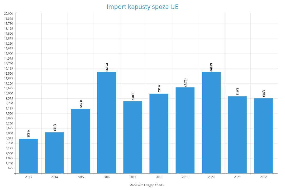 W tym wszystkim niestety nie możemy oczekiwać, że import nagle zniknie z rynku. Ważną kwestią jest więc edukowanie konsumentów na temat korzyści płynących ze wspierania lokalnego rolnictwa. Istotne stają się także formy sprzedaży bezpośredniej, w tym targi i bazary. Tutaj wymagane są jednak działania rządu, gdyż aktualnie rynek przejmują ogromne sieci handlowe, które nie liczą się z producentami warzyw… Na poniższych wykresach możemy przeanalizować skalę importu kapusty (CN: 07049010) w latach 2013-2022. Dane zostały wyrażone w tonach.