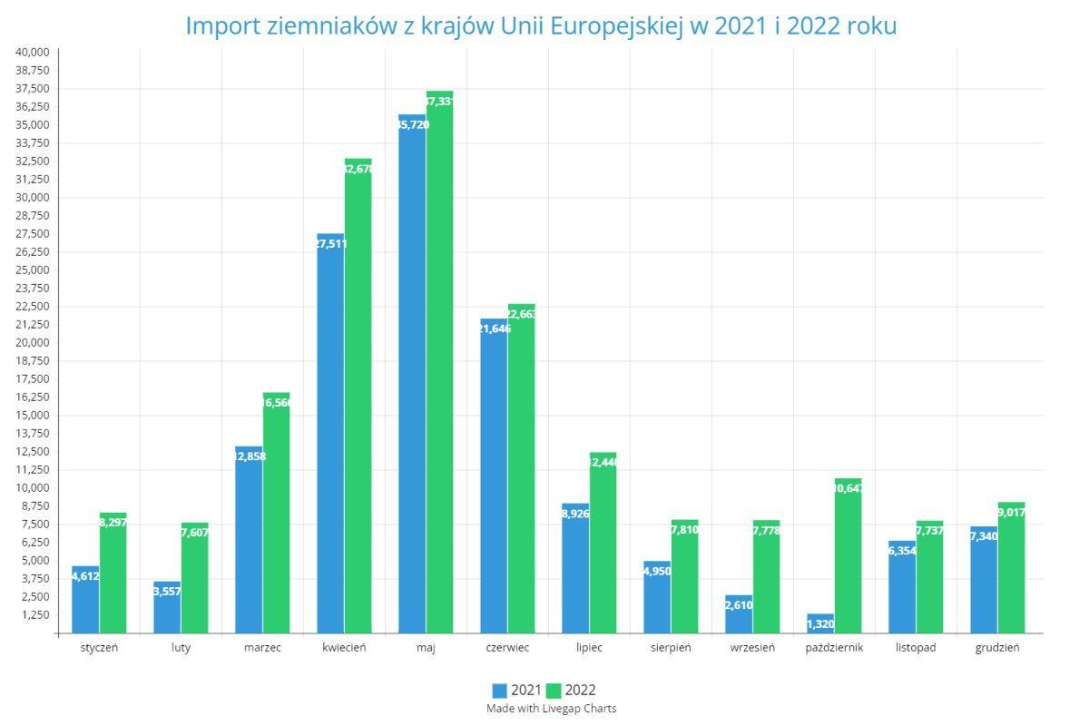 Rzeczywistość przedstawia się jednak zupełnie inaczej. Polska wraz z biegiem lat w coraz większym stopniu uzależnia się od ziemniaków pochodzących z zagranicy. W 2022 roku, porównując do roku 2021, wolumen importowanego warzywa zwiększył się bowiem dość znacząco w każdym miesiącu.