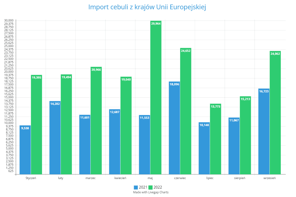 Tak jak wspominaliśmy, warunki pogodowe i inne czynniki w roku bieżącym wpłynęły na niższą podaż cebuli. Warto jednak zaznaczyć, że import okazał się zdecydowanie wyższy w każdym miesiącu aktualnego sezonu. Począwszy od stycznia i kończąc na wrześniu... Eurostat nie opublikował jeszcze danych tyczących się pozostałych miesięcy. Sytuacja jednak najprawdopodobniej się nie zmieni i niebawem ujrzymy dalszy wzrost.