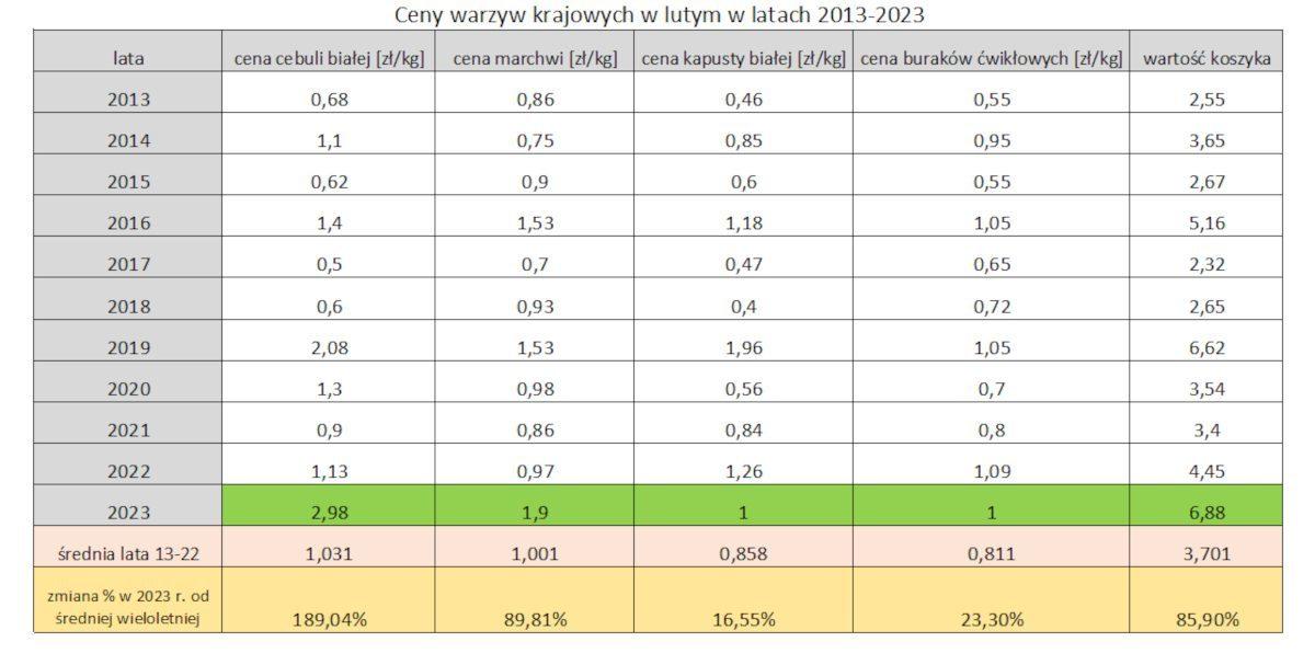 Warto więc poruszyć pewną kwestię… Kwestię cen warzyw dla producentów. Na wzgląd wyjątkowo niekorzystnych warunków na rynku, ceny wytworzonych produktów rolnych powinny wzrastać adekwatnie do ponoszonych kosztów. Jednak czy ma to odzwierciedlenie w rzeczywistości? Odpowiedzi na to pytanie możemy doszukać się w sprawozdaniu z lat 2013-2023, które odnosi się do rynku hurtowego w podwarszawskich Broniszach i zostało przygotowane przez tamtejszych specjalistów. Opisywane zestawienie przedstawia nam średnie ceny uzyskiwane przez producentów poszczególnych warzyw gruntowych w lutym.
