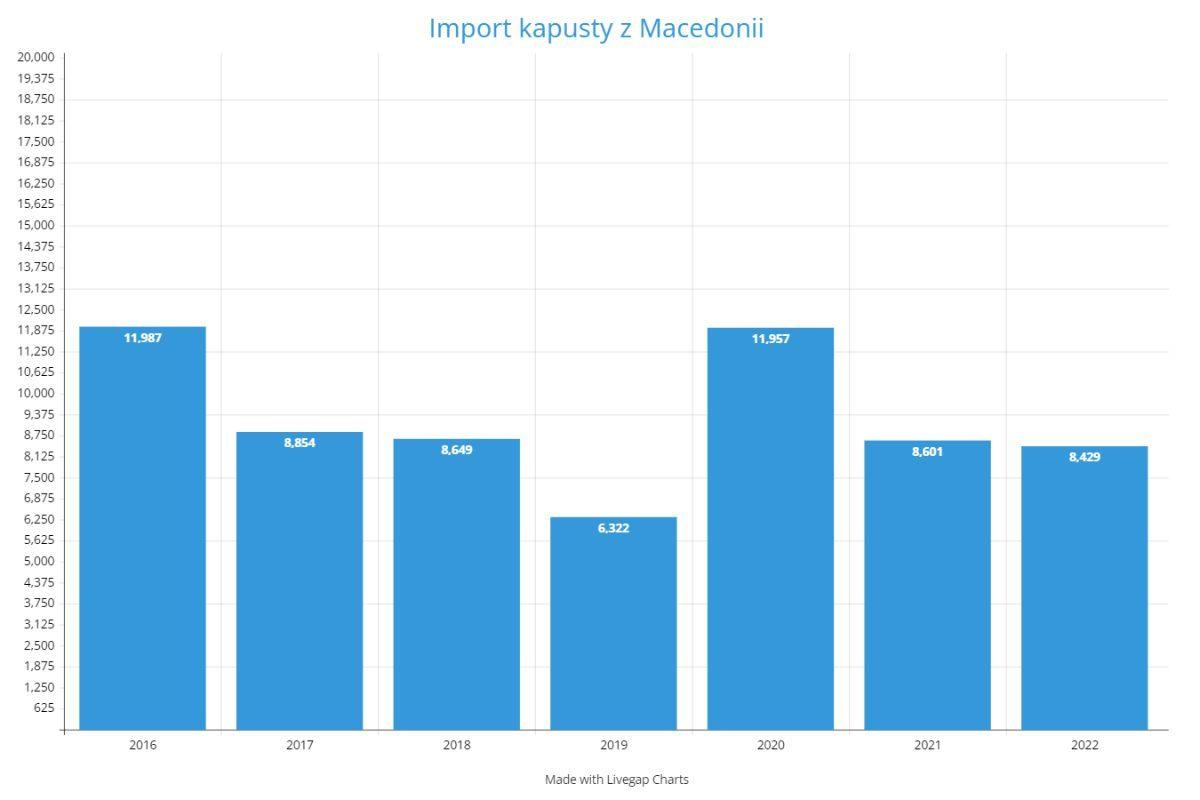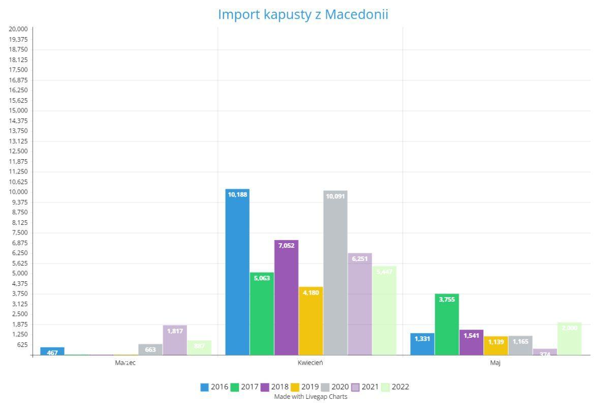 Warto również zwrócić uwagę na łączną ilość sprowadzanej kapusty w poszczególnych latach. Wykres jest bowiem potwierdzeniem, że zjawisko nie jest przypadkowe, a ilość sprowadzanej kapusty pozostaje na niemal niezmiennie wysokim poziomie. Różnice pomiędzy danymi z obydwu wykresów wynikają z faktu, że towar z Macedonii trafia do Polski również w innych miesiącach, jednak są to zdecydowanie niższe ilości niż w wyszczególnionych przez nas miesiącach, które pozostają bardzo ważne w kontekście cen uzyskiwanych przez polskich producentów na początku sezonu.