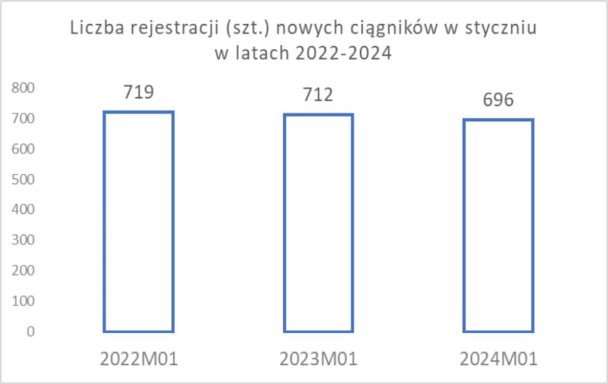 W styczniu zarejestrowano 696 sztuk nowych ciągników rolniczych. To niewiele mniej niż w poprzednich latach. W zeszłym roku rolnicy zdecydowali się bowiem na zakup 712 maszyn tego typu, natomiast dwa lata temu liczba rejestracji wyniosła 719 sztuk. Tegoroczny, styczniowy wynik jest więc o 2,2% niższy niż przed rokiem.