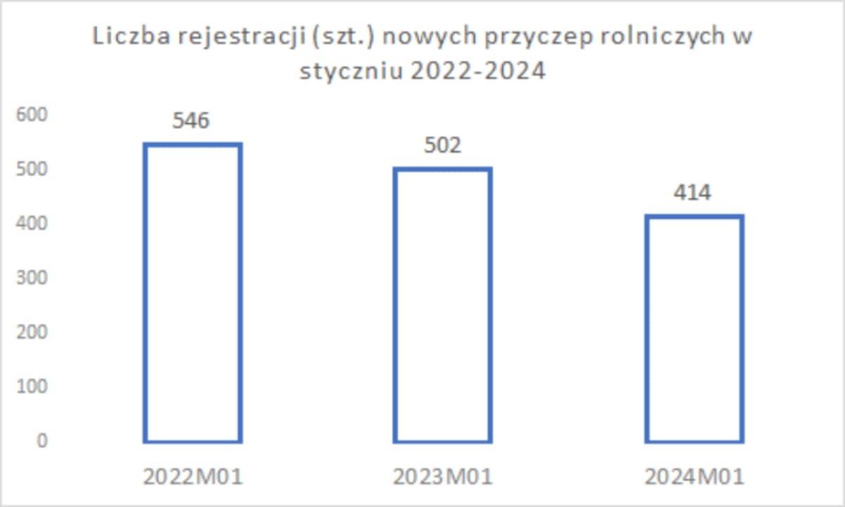 W styczniu zarejestrowano 696 nowych ciągników rolniczych, czyli o 2,2% mniej niż w 2023 roku. Sytuacja przedstawia się nieco gorzej w przypadku nowych przyczep rolniczych, których rolnicy zakupili o 17,5% mniej niż w 2023 roku. Zarejestrowano ich tylko 414 sztuk.