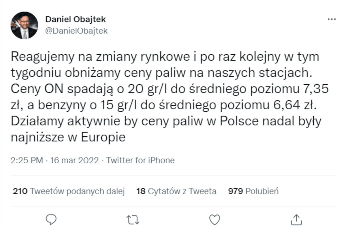 Pierwsze obniżki w tym tygodniu dały nam cień nadziei, że ceny w najbliższych dniach zaczną znacząco spadać. Niestety, po raz kolejny wspomniane obniżki nie są adekwatne do poziomu cen ropy naftowej. Patrząc na słowa Prezesa PKN Orlen odnosimy wrażenie, że Pan Obajtek patrzy na notowania ropy sprzed kilku dni… Wtedy rzeczywiście moglibyśmy mówić, że jest to uzasadnione działanie. Aktualnie wydaje się to być tylko i wyłącznie mydleniem oczu.