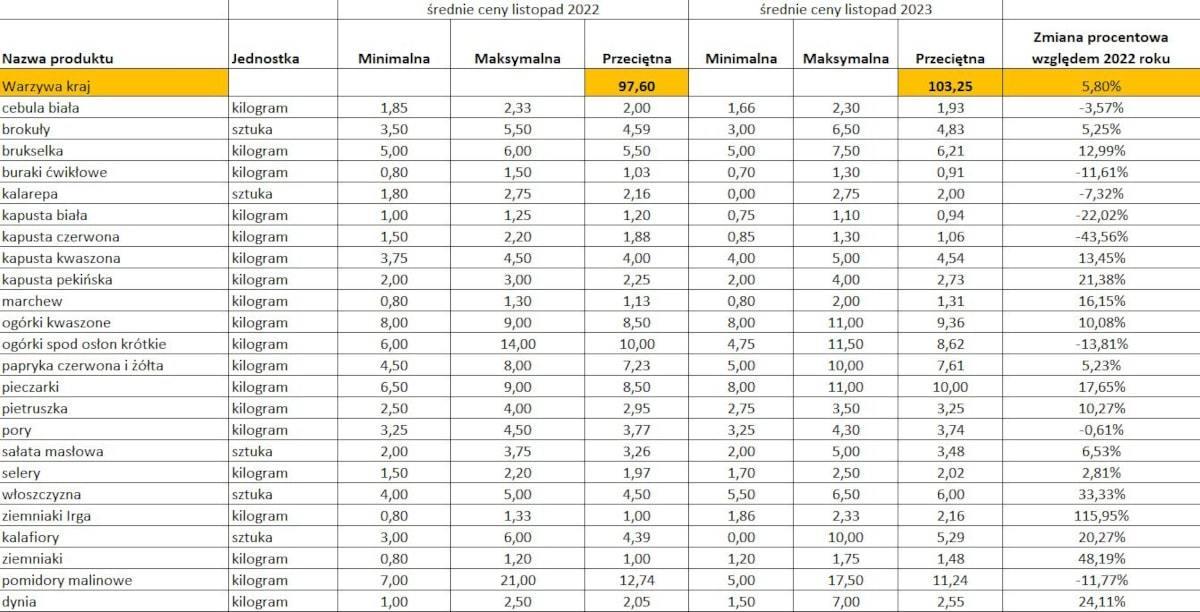 Niżej zamieszamy porównanie średnich cen warzyw w listopadzie 2022 i 2023 roku. Zestawienie przygotowali eksperci z Rynku Hurtowego Bronisze.