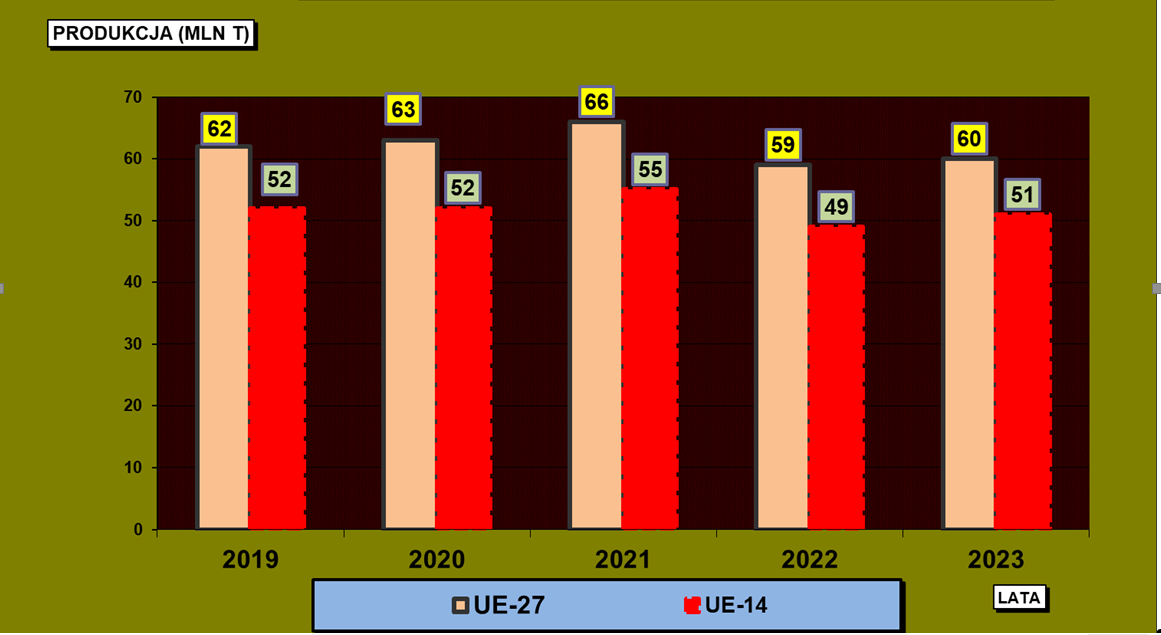 W stosunku do bardzo kryzysowego pod względem uzyskiwanych plonów sezonu 2022 (ekstremalna susza i okres pandemii) jednak nastąpił wzrost zbiorów warzyw w grupie krajów UE-14, jak i UE-13. Przyrost zbiorów w 2023 r. w grupie krajów UE-14 był wyższy niż w „nowych krajach” UE-13. Szacowany wzrost w pierwszej grupie krajów tzw. starej Unii (bardziej rozwiniętych gospodarczo) sięgał 2 mln ton (z 49 mln t do 51 mln t), podczas gdy w drugiej grupie wyniósł 1 mln t (z 59 mln t do 60 mln t) – wykres 1.