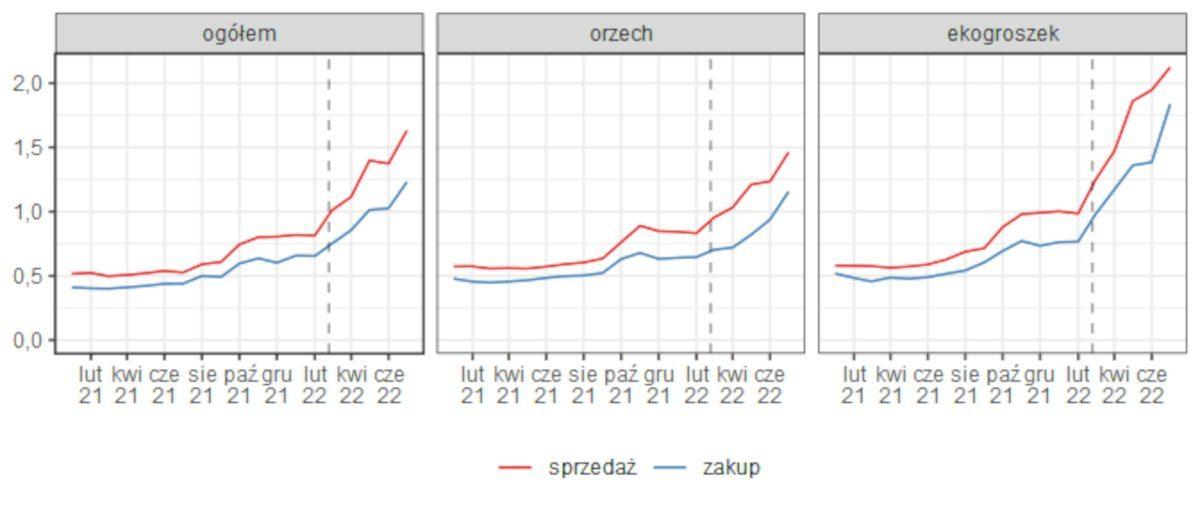 Jak podaje UOKiK, przyczyną wzrostu cen w składach węgla były głównie rosnące koszty zakupu ponoszone przez tych przedsiębiorców po 24 lutego 2022 roku, a zatem po ataku Rosji na Ukrainę. Jak widać na poniższym wykresie dotyczy to całości węgla sprzedawanego i kupowanego przez badane podmioty (panel „ogółem”). Tendencja wzrostowa widoczna jest również w odniesieniu do ceny sprzedaży najbardziej popularnych produktów – orzecha i ekogroszku. Podkreślić jednak należy, że od wybuchu wojny w Ukrainie ceny sprzedaży wszystkich sortymentów rosły proporcjonalnie do wzrostu cen ich zakupu przez składy od dostawców lub importerów.