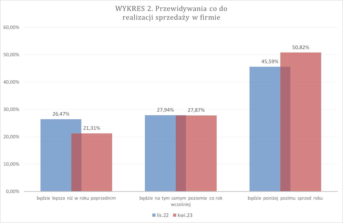 Drugim elementem, który wpłynął negatywnie na wartość indeksu są przewidywania co do sprzedaży we własnych firmach. Obecnie nieco ponad 50% przedsiębiorców przewiduje, że tegoroczne wyniki będą gorsze niż w 2022 roku – to o 5 punków procentowych więcej tego typu odpowiedzi niż pół roku temu.