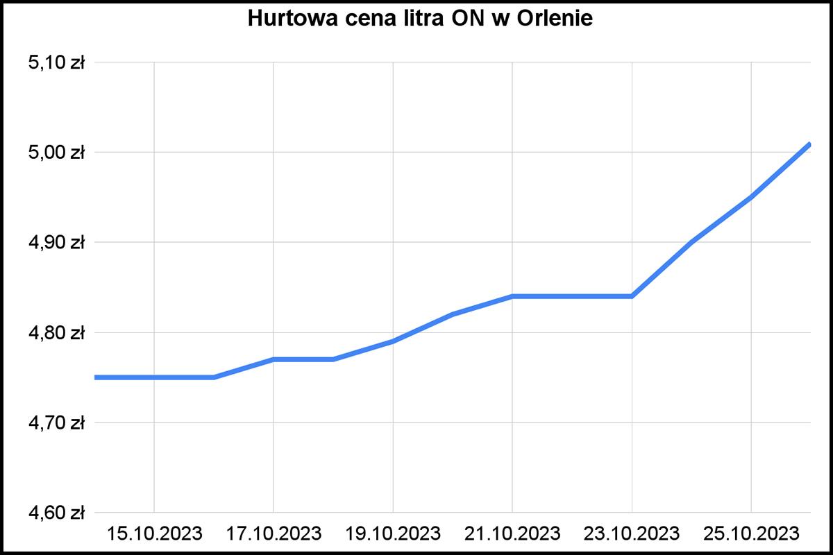 Zacznijmy od cen oleju napędowego w hurcie. W okresie przedwyborczym utrzymywały się one przez długi czas na poziomie 4,74/4,76 zł za litr. Jak natomiast sytuacja wygląda obecnie? Niedługo po wyborach ceny w hurcie zaczęły rosnąć. Nie były to wprawdzie duże wzrosty, ale systematycznie wprowadzano kolejne poprawki. Aktualnie cena ropy przedstawia się na poziomie 5,01 zł za litr. Tyczy się to surowca oferowanego przez Orlen.