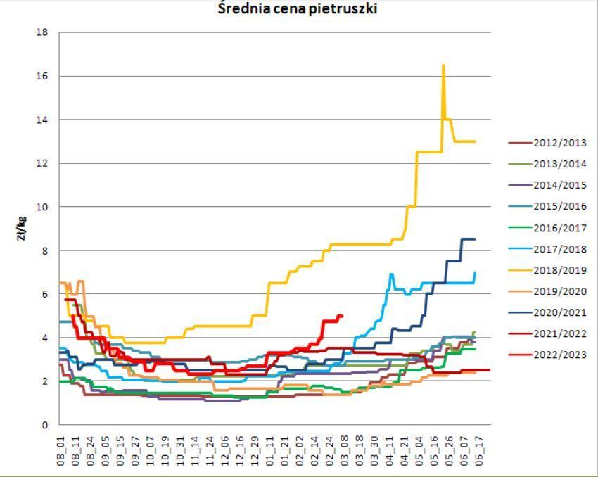 Dobrze pamiętamy rok 2018/2019, kiedy to skromne warzywo stało się gwiazdą medialną. Wówczas pietruszka osiągała rekordową cenę. Na razie do tamtych pułapów cenowych wciąż jeszcze sporo brakuje – obecna cena średnia to bowiem 5,00 zł/kg, a cztery lata temu było to już 8,25 zł/kg.