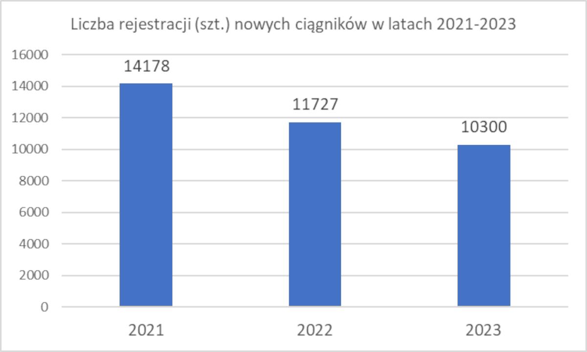 W całym 2023 roku zarejestrowano 10 300 sztuk nowych ciągników i było to mniej o 12,2% niż w 2022 roku, kiedy to zarejestrowano 11 727 sztuk tego typu maszyn (1427 sztuk więcej niż w 2023 roku). Niestety spadek widoczny jest również w porównaniu do 2021 roku. Wówczas zarejestrowano bowiem 14 178 sztuk nowych ciągników. Względem minionego roku to aż o 3878 sztuk więcej. Różnica między latami 2021 i 2023 to 37,7%.