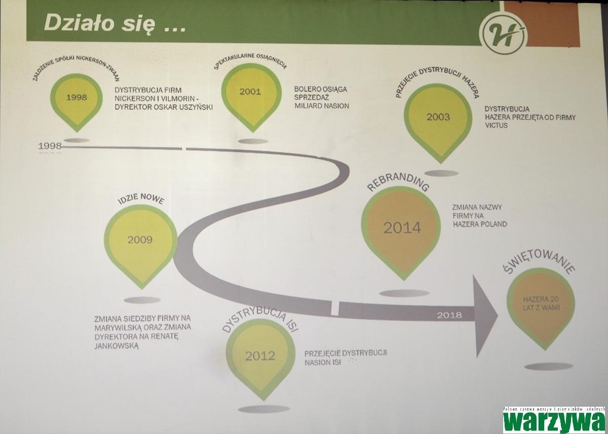 O historii firmy Hazera w Polsce opowiedział Adam Prabucki. Jako początek wskazał datę 1 września 1998 r. od spotkania Oskara Uszyńskiego z przedstawicielami firmy Nickerson-Zwaan. Kolejną ważną datą był 2001 r. – sukces odmiany marchwi Bolero (z hodowli Vilmorin). W 2003 r. nastąpiło przejęcie dystrybucji nasion marki Hazera od firmy Victus i początek sprzedaży odmian pomidorów, ogórków oraz papryki. W 2009 r. Oskar Uszyński zrezygnował z kierowania firmą, a stanowisko dyrektora generalnego w Polsce objęła Renata Jankowska. W 2012 r. oferta firmy została wzbogacona o odmiany włoskiej firmy ISI Sementi. Ostatnią z ważnych dat był rok 2014, w którym nastąpiła zmiana nazwy z Nickerson-Zwaan Sp. z o.o. na Hazera Poland Sp. z o.o. Następnie Adam Prabucki przypomniał sylwetki pracowników – zarówno tych którzy byli wcześniej związani z firmą, jak i obecnych.