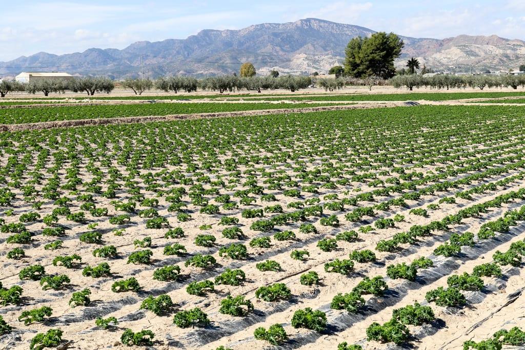 Na niektórych polach widzieliśmy nowe nasadzenia brokuła. Warzywo to w Hiszpanii najczęściej wysadzane jest ręcznie w rzędach wyścielonych czarną, biodegradowalną folią. Ręczne sadzenie prowadzone jest bardzo sprawnie, ponieważ plantatorzy używają do tego celu specjalnego urządzenia – rury zakończonej prostym system pozwalającym na umieszczenie rośliny w glebie i dociśnięcie korzeni. Pola usytuowane są na pagórkowatym terenie, gleby są bardzo zakamienione, co utrudnia wykorzystywanie tradycyjnych sadzarek. Wiele pól podzielonych jest na niewielkie kwatery, w których stosuje się zalewowy system podlewania. Najczęściej jednak rośliny nawadniane są kroplowo. Niedobór naturalnych opadów jest w tym rejonie, jednym z głównych problemów. Plantatorzy budują zbiorniki retencyjne, w których gromadzą wodę opadową.