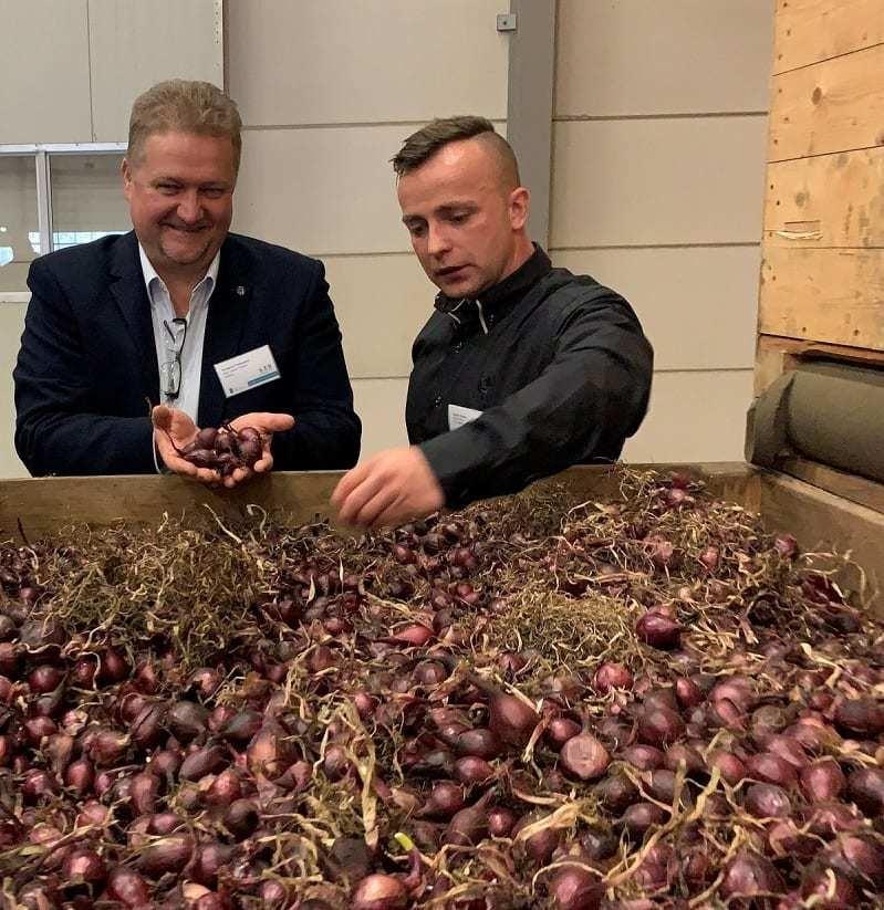 Spółka Broer B.V. w miejscowości Creil ma swoje hale magazynowe, przechowalnie i miejsce, z którego wysyłana jest dymka. Pierwsza hala, od której rozpoczęliśmy zwiedzanie to miejsce do którego plantatorzy dowożą dymkę zebraną z pola. Z pól położonych w sąsiedztwie firmy cebula dowożona jest luzem na przyczepach, a z dalszych odległości w skrzyniopaletach tirem. Rozładunek dymki dostarczonej luzem odbywa się do kosza przyjęciowego, z którego jest przesiewana na sitach, żeby wstępnie odsiać zanieczyszczenia, a następnie jest pakowana do skrzyniopalet. Tak przesiana dymka trafia następnie do suszarni. Firma Broer B.V. dysponuje jedną z największych suszarni kondensacyjnych na świecie. Proces suszenia odbywa się w ten sposób, że cebula jest schładzana zimnym powietrzem, które po ogrzaniu się jest wykorzystywane do suszenia. Czas suszenia zależy od jakości dostarczonej cebuli i wynosi ok. 5 dni. Przed przechowywaniem dymka jest sortowana. W minionym roku przesortowanie 14 tys. skrzyń zajęło tylko 3 miesiące. Wstępne sortowanie ma kilka celów, jednym z nich jest oszczędność miejsca, ponieważ odsortowywane są największe cebule – o średnicy powyżej 24 mm, które trafiają do sprzedaży. Ponadto cebule o rozmiarze 21–24 mm – zwłaszcza wczesnych odmian – są kierowane do preparowania (czyli traktowania wysoką temperaturą – 28,5°C – przez 2–4 miesięcy). Kamil Szulc informował, że w przypadku cebuli ekologicznej dymka traktowana jest temperaturą do 40–42°C przez 2–3 dni w celu zniszczenia szkodników. Pozostałe – w rozmiarze 8–21 mm – przewożone są do chłodni. To wstępne posortowanie ułatwia w późniejszym czasie logistykę związaną z przygotowaniem konkretnych zamówień. Sposób ten pozwala przyspieszyć prace, ponieważ np. sortownik jest w stanie przesortować już 30 t/godz. tej wstępnie przesortowanej cebuli, a bez sortowania wstępnego wydajność ta wynosiła tylko 10 t/godz.