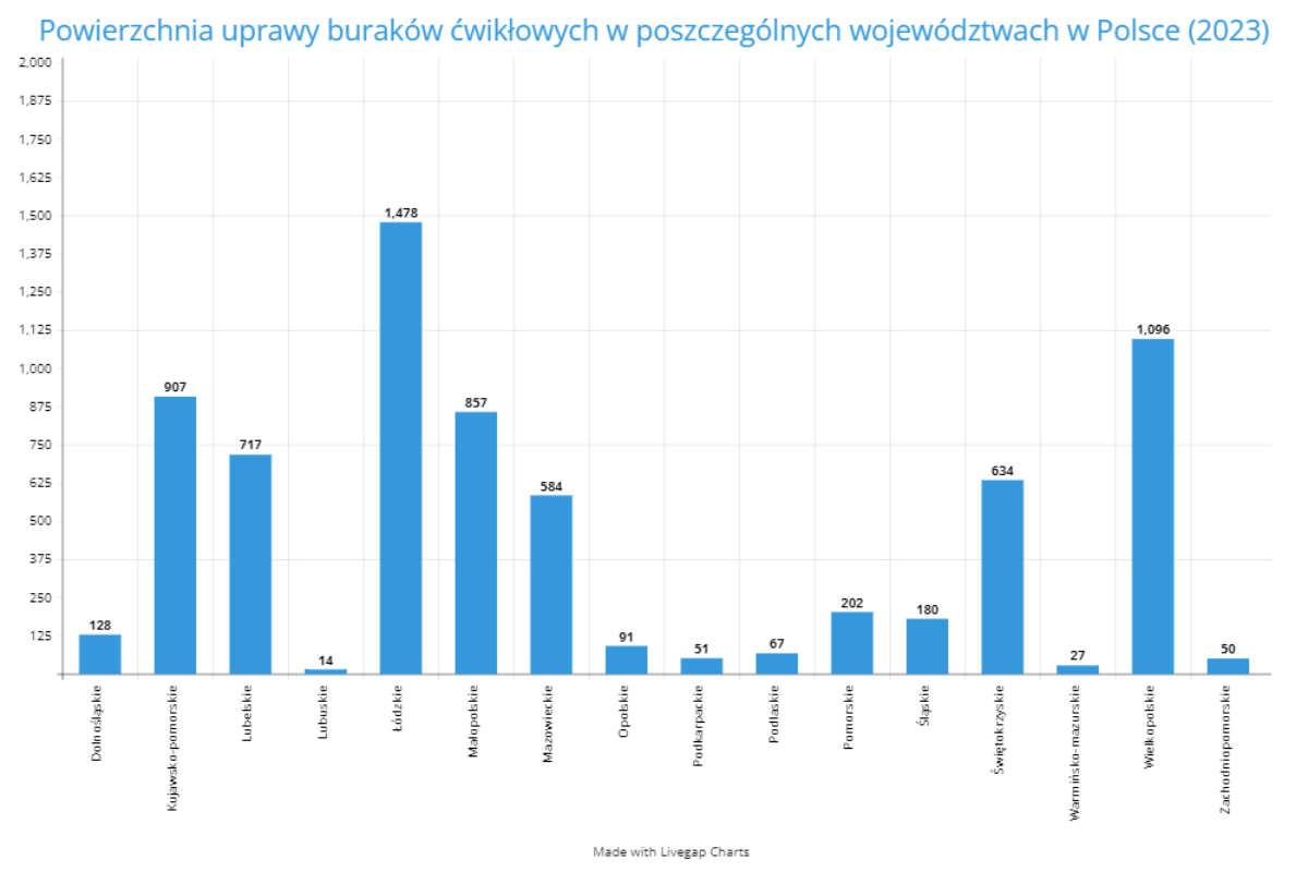 Niekwestionowanym liderem, jeśli chodzi o powierzchnię uprawy buraków ćwikłowych w 2023 roku, pozostaje województwo łódzkie. W tamtych regionach producenci przeznaczyli 1 478,67 ha pod produkcję. Na drugim miejscu plasuje się województwo wielkopolskie (1 096,43 ha). Podium zamyka natomiast województwo kujawsko-pomorskie (907,24 ha).