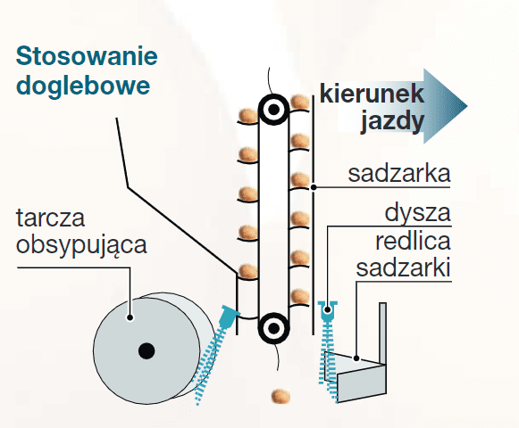Do aplikacji doglebowej podczas sadzenia specjalistka firmy Syngenta polecała preparat Amistar 250 SC zawierający azoksystrobinę. Wykonuje się nim pasowy oprysk gleby w trakcie wiosennego wysadzania bulw, używając zamontowanych na sadzarce urządzeń wyposażonych w dwie lub trzy dysze opryskujące. Należy przy tym unikać bezpośredniego opryskiwania bulw, by nie opóźniać kiełkowania i wschodów.