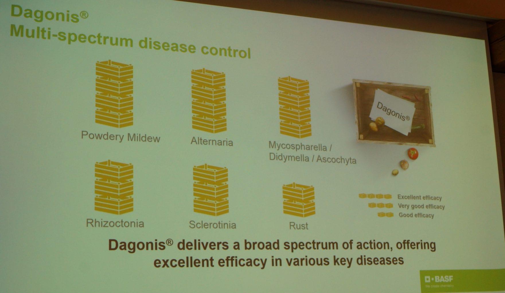 Jak informował Marcin Chojecki, reprezentant firmy BASF Polska, preparat będzie w komercji w 2019 r. Badania przeprowadzone przez BASF wykazały wysoką skuteczność preparatu Dagonis przed chorobami powodowanymi przez grzyby z rodzaju m.in.: Alternaria, Rhizoctonia, Sclerotinia, Mycospharella, Didymella, Ascochyta oraz przeciwko mączniakowi prawdziwemu, zgniliźnie twardzikowej i rdzy.