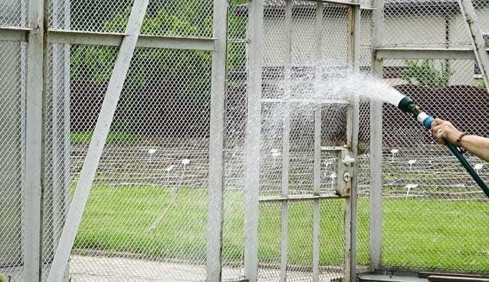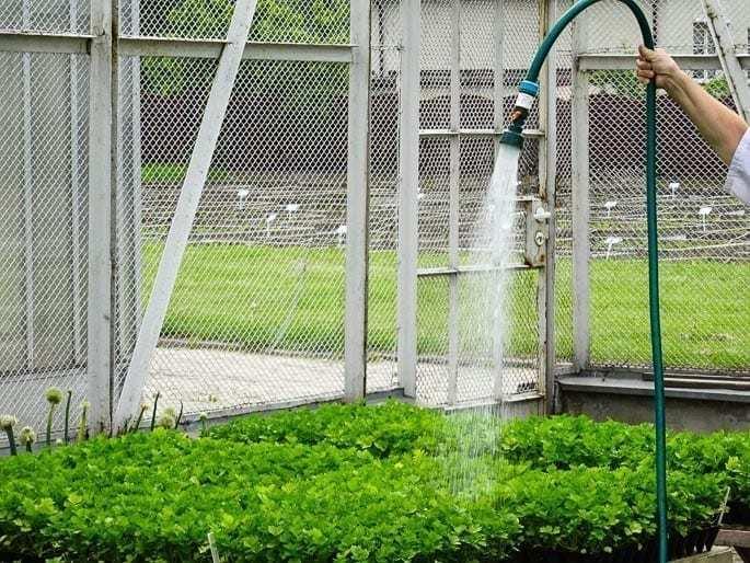 W jaki więc sposób podlewać rośliny, aby zapewnić równomierną wilgotność podłoża? Prelegentka radziła, że dysponując wężem z sitkiem, należy prowadzić wąż równomiernym ruchem ręki nad roślinami tak, aby woda spadała na nie pionowo (fot. 4). Wtedy substrat będzie równomiernie nawodniony. W mnożarce można zainstalować również prosty system zraszania bądź też zamiast sitka na nasadę węża nałożyć plastikową butelkę, podziurawioną w pionie, co spowoduje, że krople będą drobniejsze i korzystniejszy będzie ich rozkład w strumieniu wody niż przy użyciu okrągłego sitka.