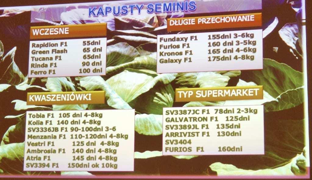 Przybyłych producentów warzyw przywitali organizatorzy spotkania Damian i Elżbieta Cebulscy z firmy Agro-Seed z Opatkowic. Monika Buława reprezentująca firmę Bayer (marka Seminis) przybliżyła ofertę warzyw na najbliższy sezon. W segmencie kapusty głowiastej białej o krótkim okresie wegetacji (ok. 55 dni) prelegentka wyróżniła dwa mieszańce Pandion F1 i Rapidion F1. Z kolei z nowości polecanej do uprawy pod płaskie osłony zwróciła uwagę na odmianę Green Flash F1 (65 dni) o kompaktowych główkach osiągających masę dochodzącą do 2 kg. Wśród kapusty z przeznaczeniem do przechowywania wyróżniła mieszańce Galvatron F1, Furios F1, Kronos F1.