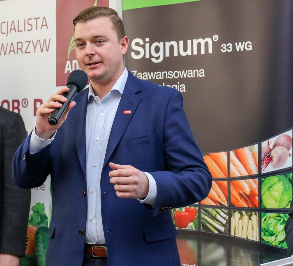 Spośród fungicydów w ochronie warzyw Maciej Wita rekomendował stosowanie Cabrio Duo 112 EC, który ma rejestrację m.in. w pomidorze, sałacie, cebuli, ogórku i ziemniaku. Szczególnie wysoką skuteczność zdaniem prelegenta środek ten wykazuje w zwalczaniu mączniaka rzekomego cebuli (zarówno zapobiegawczo, jak i interwencyjnie), a także przeciwko alternariozie pomidora. Ponadto Maciej Wita rekomendował w ochronie wielu gatunków warzyw środek Signum 33 WG, zawierający dwie substancje czynne – pirakolstrobinę i boskalid, dzięki czemu zawdzięcza swoją wysoką skuteczność. W minionym roku etykieta rejestracyjna tego produktu została rozszerzona o nową chorobę cebuli – Stemphylium vesicarium, a także w ochronie grochu „na zielono” przeciwko askochytozie i czekoladowej plamistości. Maciej Wita podpowidała również, że Signum 33 WG skutecznie zwalcza choroby marchwi – alternariozę i mączniaka prawdziwego, a ponadto, jak wykazują badania holenderskie ogranicza również rozwój zgnilizny twardzikowej, z tym, że w przypadku tej ostatniej choroby, zabieg konieczny jest dość wcześnie – na początku przyrastania korzeni na grubość.