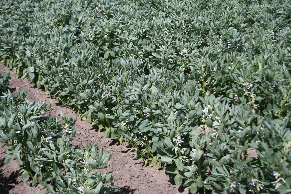 Fot. Uprawa bobu Bachus a) w nieosłoniętym polu, b) w tunelu foliowym