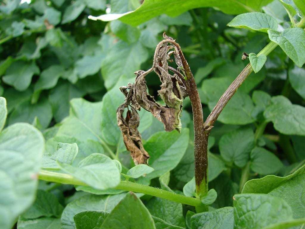 Przy dużej presji patogenu łodygi łamią się w miejscu występowania plam. Bulwy ziemniaków także mogą być porażane w czasie wegetacji roślin przez zarodniki P. infestans. Zarodniki te mogą dostać się do gleby wraz z wodą deszczową oraz podczas zbiorów. Na porażonej powierzchni bulw występują sine lub ciemne brązowe plamy, które przy silnym porażeniu zagłębiają się, a miąższ w miejscu ich występowania staje się rdzawobrunatny i twardy.