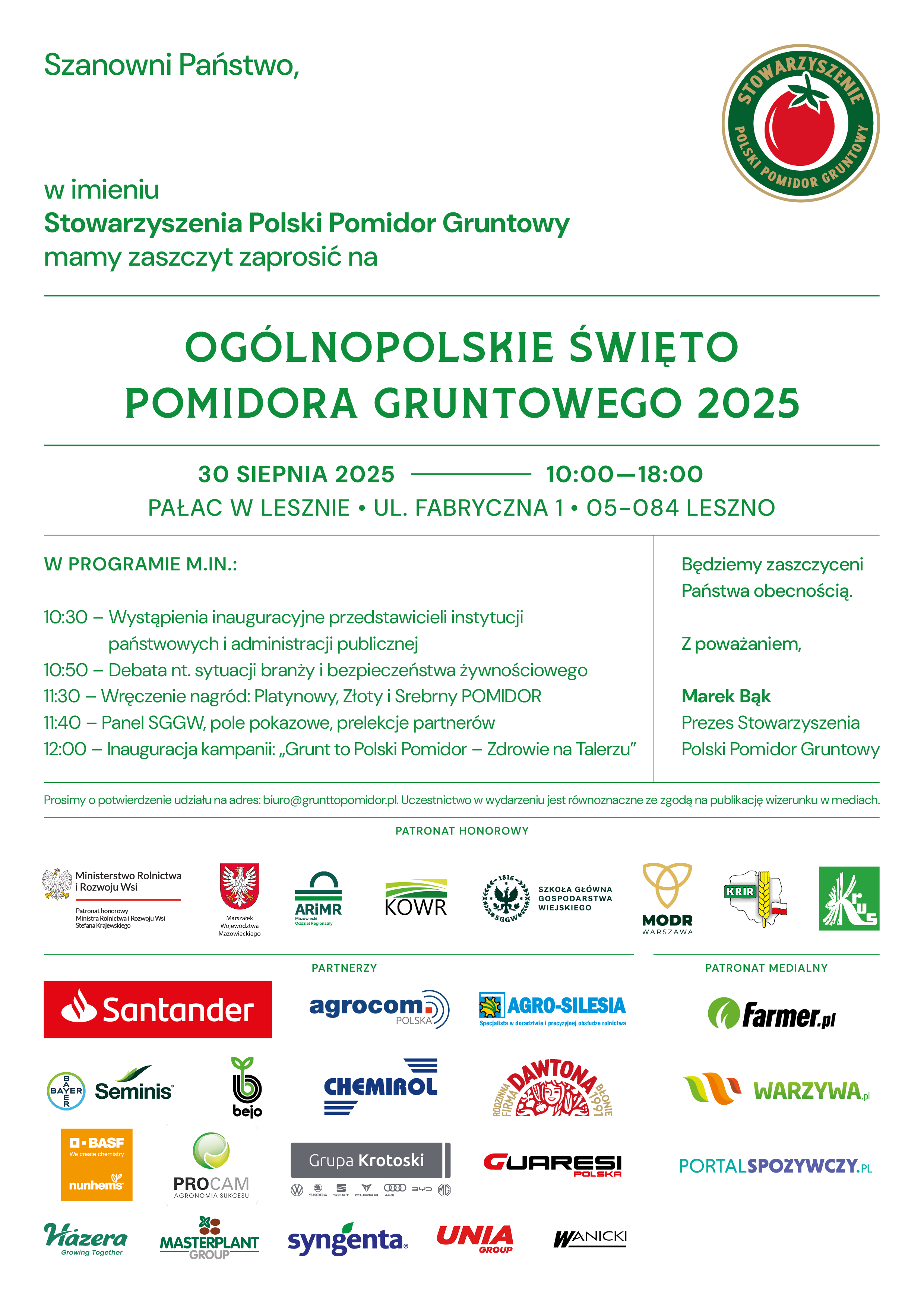 Ogólnopolskie Święto Pomidora Gruntowego 2025 organizowane przez Stowarzyszenie Polskiego Pomidora Gruntowego to okazja do nawiązania relacji biznesowych, pogłębienia wiedzy na temat sektora pomidorowego i wymiany doświadczeń.