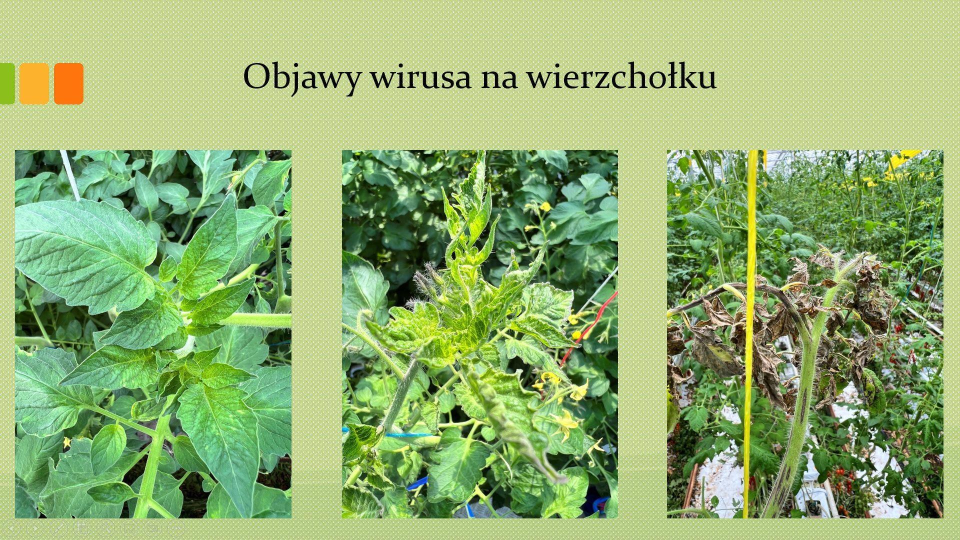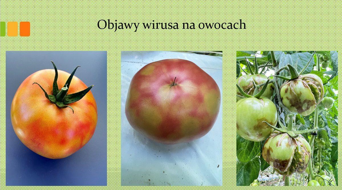 Zdjęcia z objawami wirusa pochodzą z prezentacji Piotra Słomianego prezentowanej podczas debaty na temat "Jak żyć z wirusem ToBRFV", która odbyła się 26 stycznia 2023 r. w Sobieniach Szlacheckich.