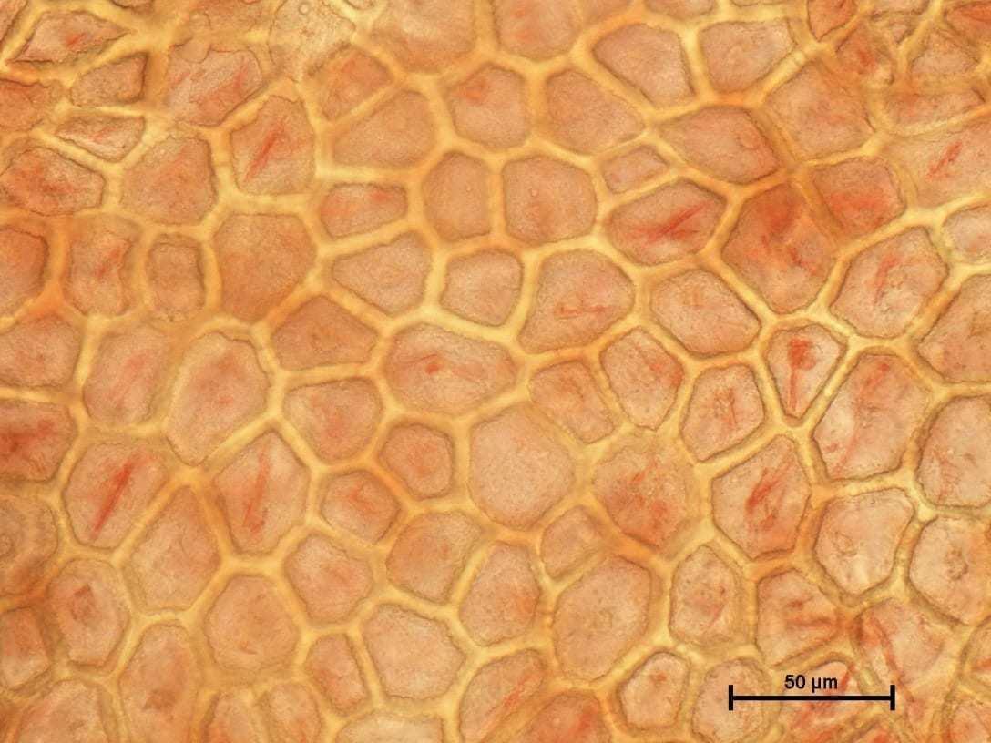 Obserwacje i badania mikroskopowe objęły porównanie wybarwiania się owoców odmian pomidora czerwonego i dwóch odmian pomidora malinowego. W doświadczeniu prowadzonym kilka lat temu w IO w Skierniewicach zaobserwowano więcej nieprawidłowo wybarwiających się pomidorów odmiany malinowej niż w porównywanej i wrażliwej na tę cechę czerwonoowocowej odmianie Remiz F1. Pomidory malinowe miały też tendencję do poprzecznych, dosyć rozległych spękań w warunkach deficytu światła i dużego zróżnicowania temperatury między nocą dniem oraz skoków wilgotności powietrza. Owoce malinowe nie miały tendencji do tworzenia zielonej czy żółtej piętki, a pozostające na nich jasno zielone plamy rozmieszczone były nierównomiernie. Duża powierzchnia dosyć szerokich liści sprzyjała temu zjawisku. Komórki skórki pomidora malinowego były bardziej zróżnicowane pod względem wielkości i zdecydowanie jaśniejsze niż tradycyjnie czerwonego owocu. Obserwowane były również zmiany w intensywności zabarwienia poszczególnych komórek skórki owocu, co świadczy o różnicach w zawartości karotenoidów. Owoce dwóch odmian pomidora różniących się kształtem i wielkością wykazywały też inną podobną, niekorzystną cechę, widoczną gołym okiem. Otóż pod lśniącą i niezbyt grubą skórką widoczne były gęsto rozlokowane na całej powierzchni srebrno-białe kropki różnej wielkości. Mikroskopowa analiza wykazała, że są to gęsto upakowane skupiska drobnych, bezbarwnych kryształów rozlokowane na różnych głębokościach miękiszu ściany owocu. Obrazy tkanek owocu analizowane w polaryzacyjnym świetle mikroskopu potwierdziły krystaliczną formę tych struktur. Konglomeraty te mogą być efektem kumulacji bezbarwnych związków chemicznych, prekursorów karotenoidów, które „zatrzymały się” na szlaku metabolicznym z powodu braku optymalnych warunków środowiska do osiągnięcia zabarwienia. Jest również możliwe, że są to kryształy związków wapnia.