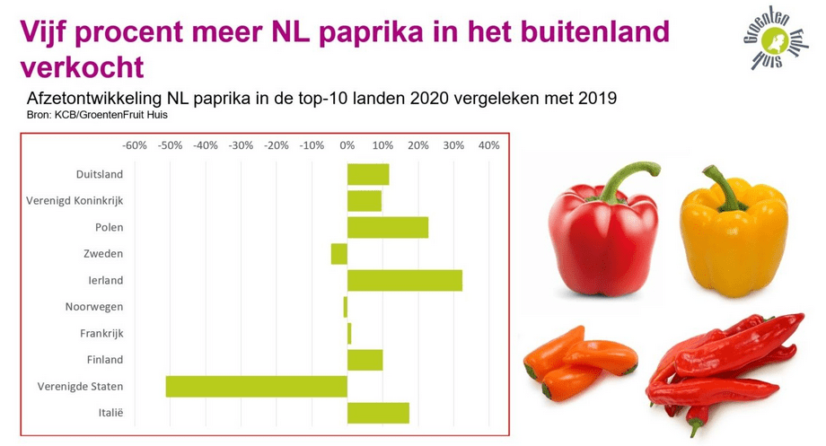 Krajowa sprzedaż holenderskiej papryki również wzrosła. Supermarkety w Holandii sprzedały o 18 procent więcej niż roku poprzednim. Z drugiej strony, ze względu na kryzys restauracje i firmy cateringowe przetwarzały mniej papryki. Ze względu na wysokie koszty transportu i mniejszą liczbę lotów eksport do odległych miejsc znacznie spadł. Na przykład w 2020 r. eksport do USA zmniejszył się o połowę. W rezultacie kraj ten spadł na liście odbiorców tego warzywa z 4. miejsca w 2019 roku na pozycję 9 w ubiegłym roku.