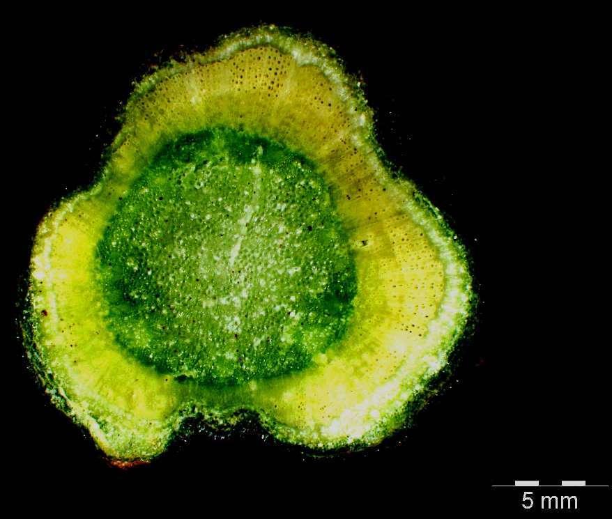 i obejmuje ułożone pierścieniowo następujące elementy: łyko zewnętrzne (floem zewnętrzny – transportujący asymilaty z liści w kierunku korzenia), kambium/miazgę (wtórna tkanka twórcza inicjująca nowe komórki zarówno łyka, jak i drewna), drewno (ksylem – przewodzący wodę z zawartymi w niej związkami chemicznymi/nawozami), łyko wewnętrzne (floem wewnętrzny). Tkankę rdzenia stanowią duże komórki miękiszowe, z których część traci ściany komórkowe i zanika, przez co tworzy centralnie usytuowany,
