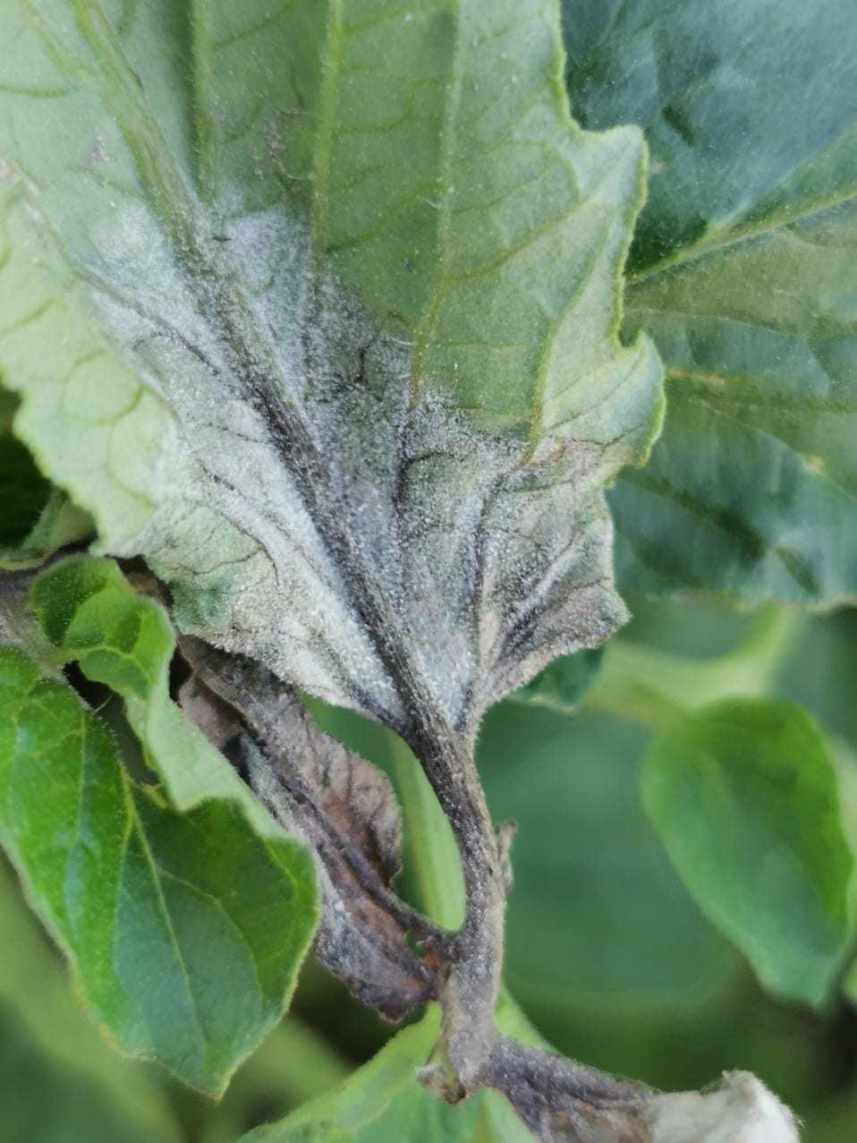 Fot. 3. Objawy zarazy ziemniaka na liściu pomidora.