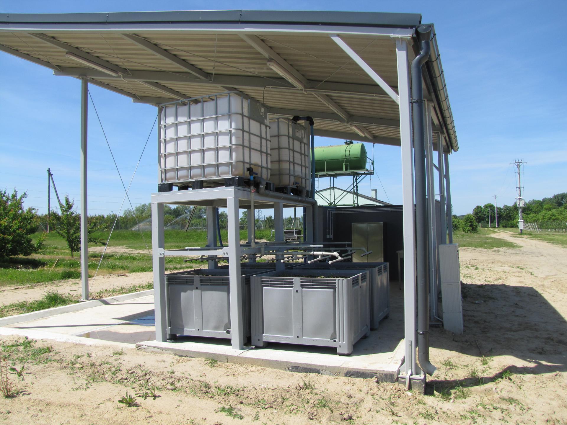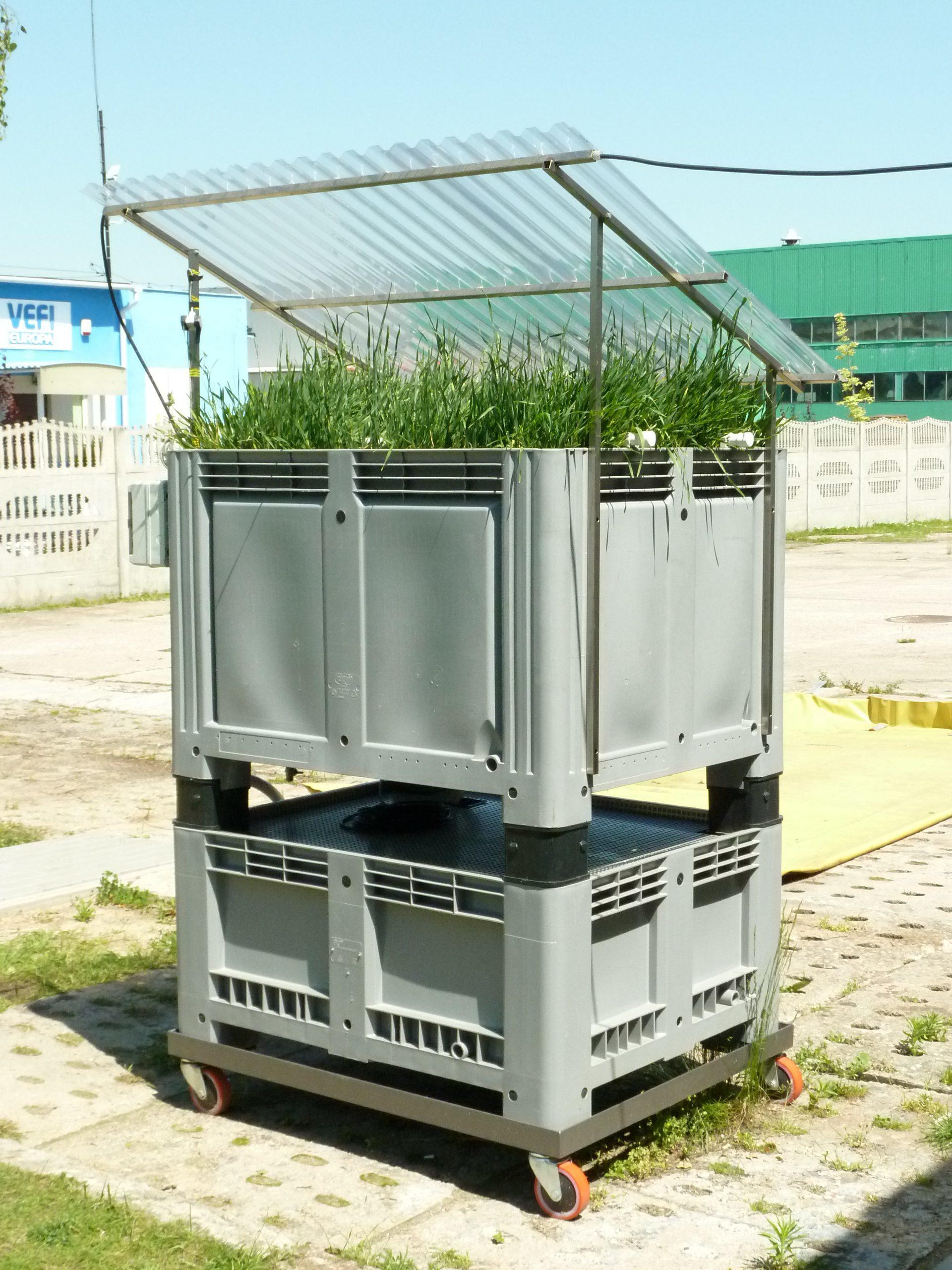 Zadaszona skrzyniopaleta z substratem (700 l) znajduje się nad drugą, płytszą skrzyniopaletą (400 l), która spełnia rolę zbiornika buforowego i dehydratacyjnego. Całość stanowi zwarty system przeznaczony dla gospodarstw ogrodniczych.