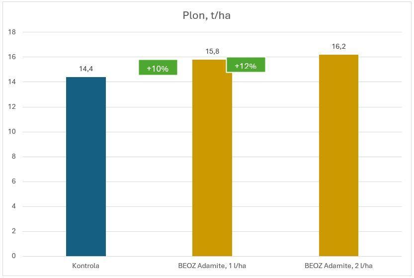 Rośliny opryskane BEOZ ADAMITE wykształciły więcej strąków o większej masie, były bardziej żywo zielone niż rośliny na części kontrolnej oraz wykształciły liście o większej powierzchni blaszki liściowej.