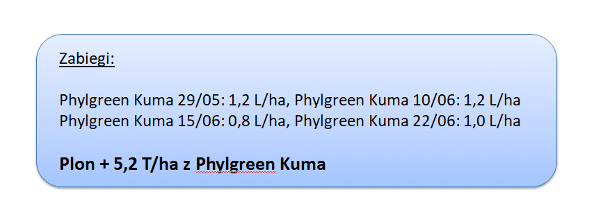 W minionym sezonie zadowalające efekty przyniosło również systematyczne stosowanie w małych dawkach produktu Phylgreen Kuma. Jest on oparty na zimnym ekstrakcie z alg Ascophylum nodosum wzbogaconym w aminokwasy. Stosowanie tego produktu pozwala w nowatorski sposób podejść do zapobiegania stresom abiotycznym oraz regeneracji roślin po ich przebyciu. Stosują systematycznie Phylgreen Kuma wykorzystuje się efekt primactive, który indukuje w roślinach wyższa tolerancję na niekorzystne warunki pogodowe. Rośliny w dużo mniejszym stopniu spowalniają swój metabolizm w okresie stresu i szybciej odbudowują swój metabolizm po jego ustąpieniu.
