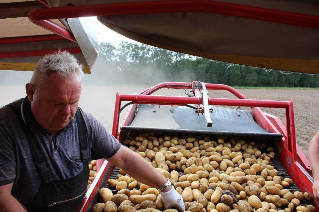 - Ten sezon jest zupełnie wyjątkowy. Po ubiegłorocznej niezwykle mokrej jesieni, wiosna okazała się również nietypowa – przyszła nagle, zrobiło się bardzo gorąco i sucho i, taka pogoda utrzymuje się przez wiele miesięcy, aż do chwili obecnej. Wpłynęło to na warunki na polu i wegetację roślin. Przygotowując w tym sezonie pola pod ziemniaki kierowałem się doświadczeniami z lat poprzednich, ale okazało się, że każdy rok jest zupełnie inny. Wykonując wiosną analizę chemiczną gleby ustaliliśmy, że praktycznie nie było w niej potasu, mimo, że jeszcze jesienią ubiegłego roku zawartość tego pierwiastka była znaczna. Wysokie nawożenie potasem to zatem największa zmiana jaką musiałem zastosować w programie nawożenia. Pozostałe nawozy stosowane były standardowo. Azotu, w zależności od odmiany, zastosowano 130 do 160 kg, fosforu ok. 150 kg (w zależności od zasobności gleby), magnezu ok. 50 kg, a dawkę siarki, którą również bilansujemy, ustaliliśmy na poziomie zbliżonym do ilości podawanego azotu. Główną odmianą posadzoną na polu pokazowym jest Jazzy. Pole to zaliczam do lepszych kompleksów w swoim gospodarstwie, znajduje się ono w zasięgu deszczowni, dlatego uzyskane plony, które po przeprowadzeniu prób kopania szacujemy na 60–61 t/ha, nie są miarodajne w stosunku do innych pól, na których nie było możliwości nawadniania. Wiemy już, że warunki do kopania są bardzo trudne, ziemia jest tak sucha, że spada zaraz po wejściu na taśmy. Zostają na nich wyłącznie bulwy i grudy, co wiąże się z olbrzymim ryzykiem uszkodzeń naskórka ziemniaków, a w tym roku moim zdaniem warto przypilnować jakości towaru, który wkładamy do przechowalni, bo jest szansa, że na nim zarobimy. Jedną z nowości stosowanych w naszym gospodarstwie jest mikronawożenie, które testujemy od trzech lat we współpracy z firmą ADOB. Nawóz startowy w postaci mikrogranulatu, który bardzo szybko rozpuszcza się w glebie, podsypywany jest podczas sadzenia w okolice bulwy (ok. 6 cm od sadzeniaka). Wspomaga on wschody ziemniaków oraz rozwój systemu korzeniowego. Stosujemy trzy warianty nawożenia: pasy kontrolne bez nawozów startowych, pasy w których stosujemy pełną dawkę nawozów (20 kg/ha), oraz pasy z połową dawki (10 kg/ha). Na podstawie doświadczeń z minionych trzech lat mogę stwierdzić, że warto inwestować w tę technologię, choć jakiego rzędu są to korzyści precyzyjnie określimy w tym roku – w roku minionym z powodu podmoknięć wielu pól trudno to było zadowalająco ocenić. Chciałbym również zwrócić uwagę na problem z odchwaszczaniem ziemniaków jaki pojawi się w związku z wycofaniem linuronu – wyjaśniał Tomasz Jazdon.
