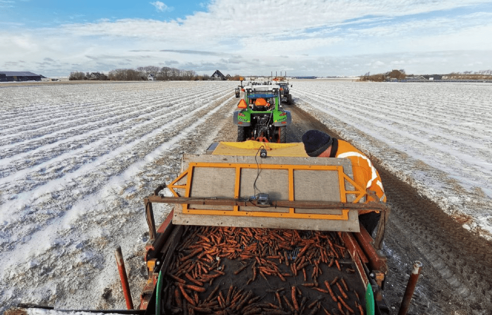 Gustaaf Hoogland mówi, że w tych okolicznościach zbiory przebiegają dobrze. „Marchewka ładnie wychodzi z ziemi. Nie stwierdziliśmy uszkodzeń spowodowanych mrozem, a ich jakość jest dobra. Okrycie roślin warstwą słomy jest to praktyczny sposób przechowywania korzeni. Marchew po raz pierwszy przykryto w październiku, wykorzystując do tego 21 ton słomy na hektar, a do tego w grudniu założono płaską osłonę z tworzywa sztucznego. Biorąc pod uwagę obecne warunki zimowe, to dobrze, że zdecydowaliśmy się na gruby podkład ze słomy. W każdym razie marchewki są teraz dobrze chronione przed spadkiem temperatury.