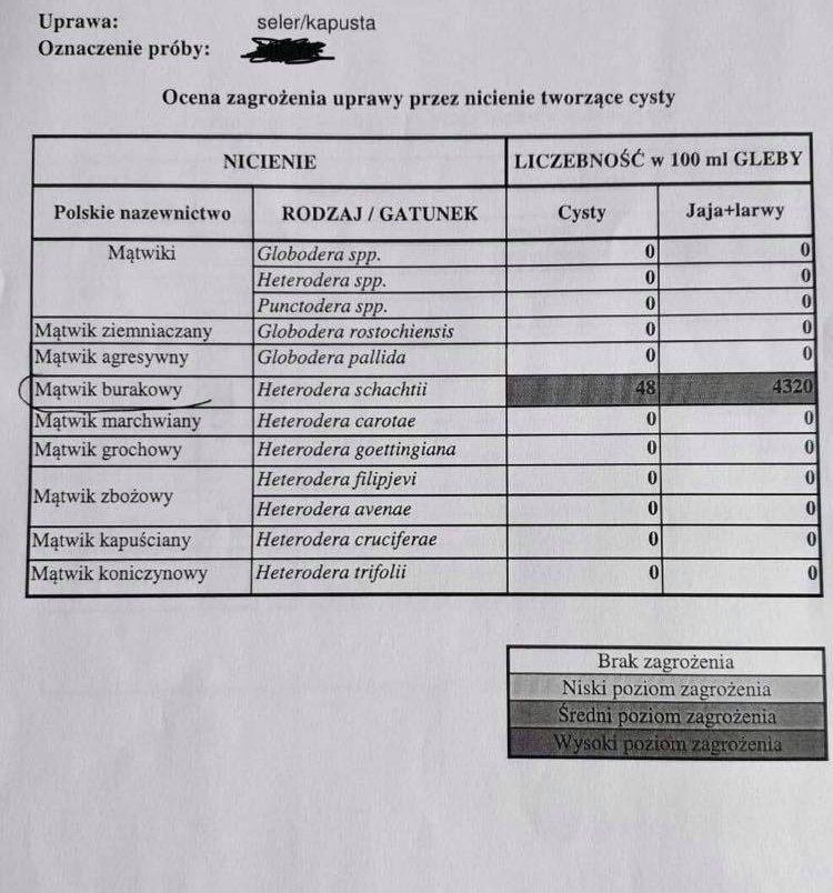 Na plantacji kapusty naszego rolnika z woj. małopolskiego po posadzeniu rozsady rośliny podjęły wzrost prawidłowo. Z czasem pojawił się słabszy wzrost, przebarwienia liści i placowe wypadanie roślin. Pierwszą myślą jaką rolnik zaczął analizować były czynniki agrotechniczne. Przebarwienia na liściach nasunęły myśl o problemach z zasobnością gleby, jednak zawartość składników pokarmowych według wyników analizy była na poziomie odpowiednim dla kapusty. Wątpliwości wzbudził stan systemu korzeniowego słabszych roślin, który miał postać brody korzeniowej utworzonej z licznych drobnych korzeni oraz obecność cyst. Nasunęło to podejrzenie, że rośliny są porażone przez nicienie, co okazało się słusznym tropem. Wyniki badania potwierdziły obecność mątwika burakowego.