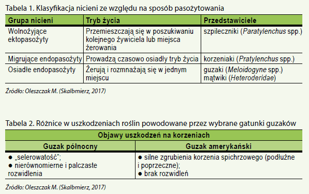 Guzaki (tab. 2). Do tej pory opisano około 90 gatunków guzaków, z czego 23 występuje w Europie. W Polsce największe szkody w uprawach warzyw wyrządza guzak północny (Meloidogyne hapla), który zasiedla rośliny dwuliścienne (sporadycznie jednoliścienne). W innych krajach starego kontynentu o klimacie zbliżonym do Polski notuje się także wzmożoną aktywność guzaka holenderskiego (M. fallax) oraz guzaka amerykańskiego (M. chitwoodi), którego obecność stwierdzono już w Belgii, we Francji, w Niemczech, Holandii i Szwajcarii. Oba gatunki są szkodnikami kwarantannowymi.